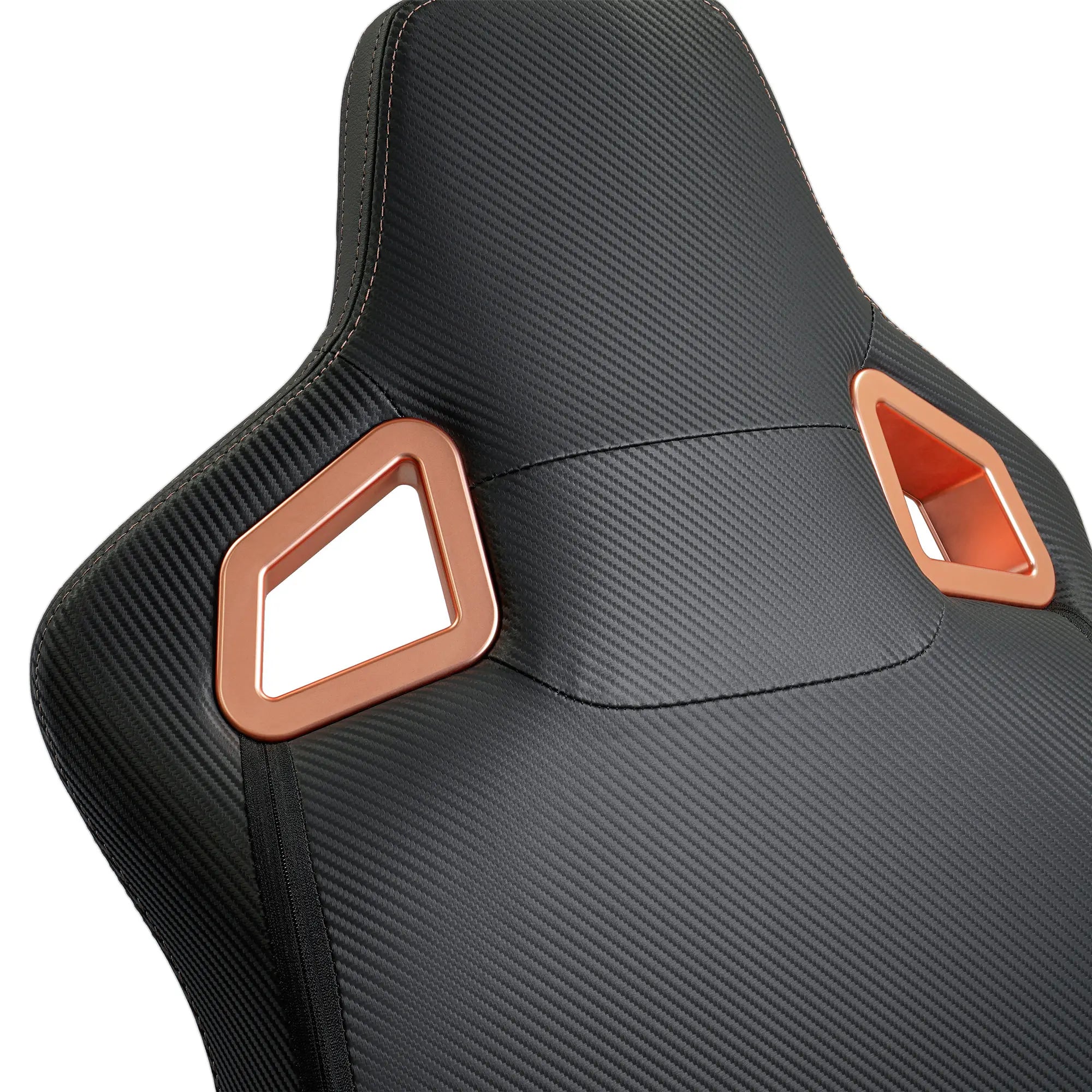 背もたれの背面・側面にはカーボン柄のPUレザーを全面に使用。カッパーのメタリックな質感を引き立てながら、工業製品としての武骨さも主張するスタイル。